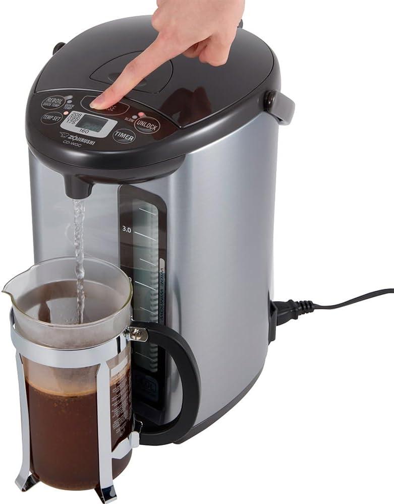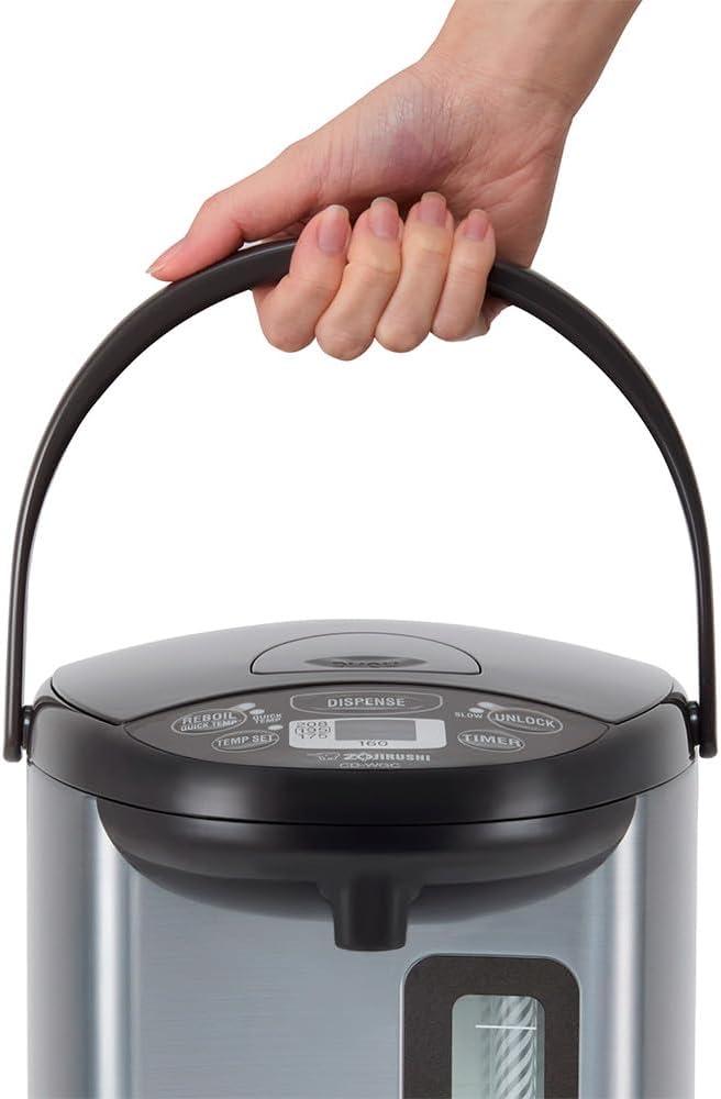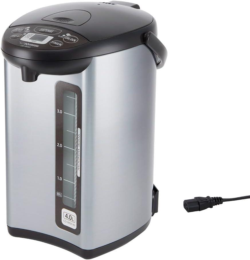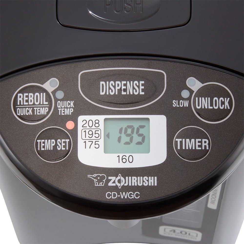 Zojirushi's Micom Water Boiler & Warmer, availalbe in 3.0 and 4.0 liter capacity, boils and keeps water hot at a set temperature for as long as it's plugged in. Select from one of 4 keep warm temperature settings (160 DegreeF, 175 DegreeF, 195 DegreeF, 208 DegreeF) which are the optimal temperatures for brewing different varieties of tea. The Optional Quick Temp mode reaches 160 DegreeF, 175 DegreeF, or 195 DegreeF keep warm directly without reaching a boil. Includes energy-saving timer function (6-10 hours), Cafe drip dispensing mode for slower dispensing, and Swivel base for serving convenience. Interior is made of rust-resistant stainless steel. Zojirushi's Commitment to Safe Design: Automatic shut-off prevents boil dry; automatic dispense-lock prevents accidental dispensing; in-spout and in-lid protection prevents leakage when tilted or tipped over, or dripping after dispensing.