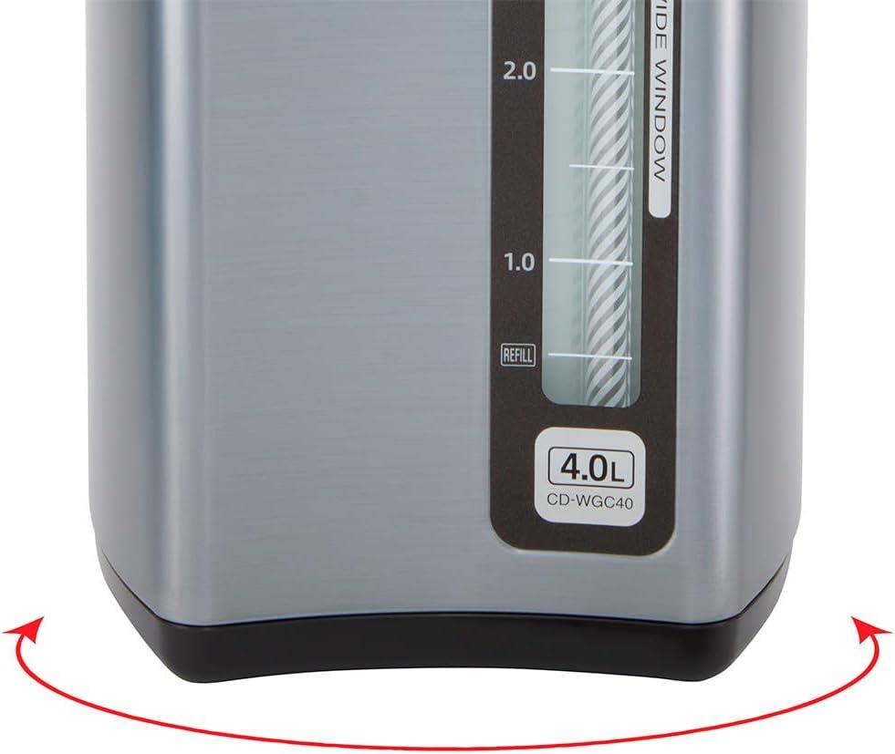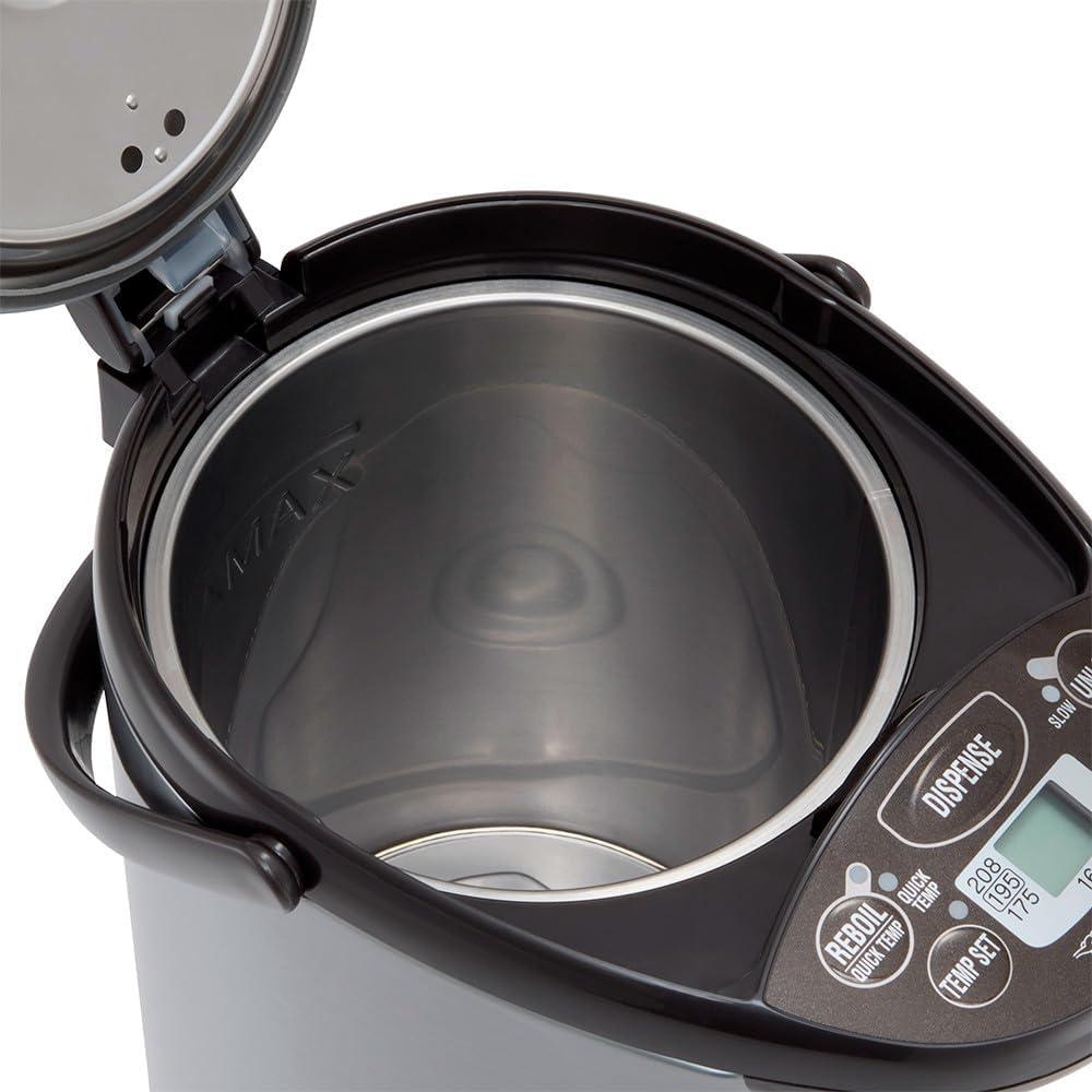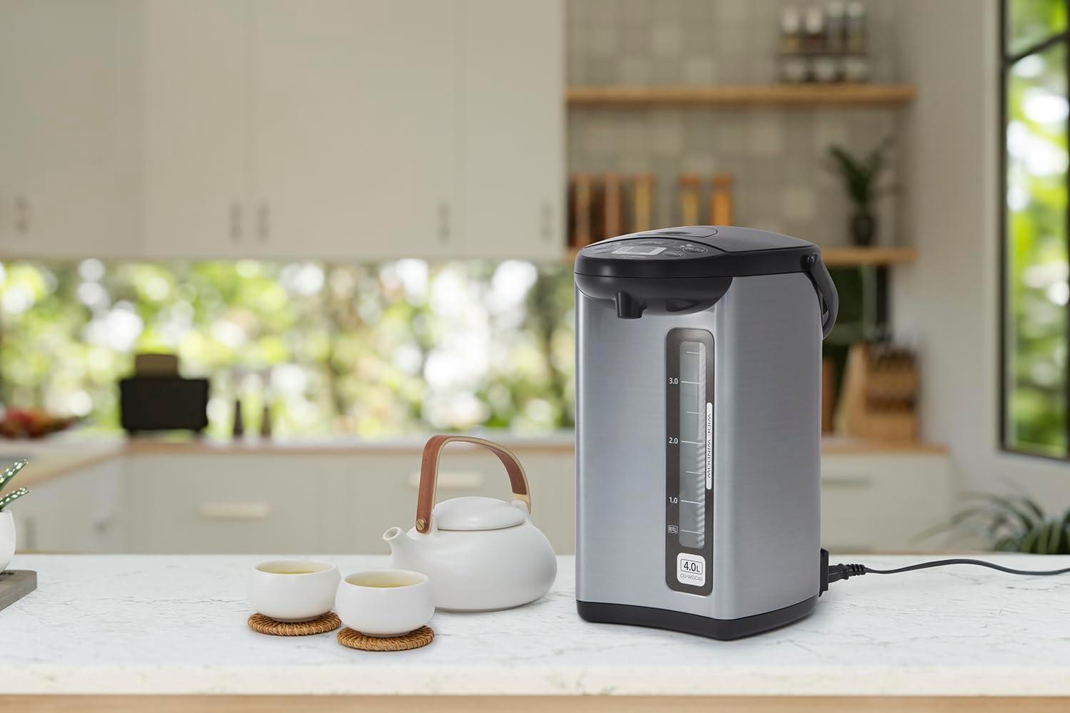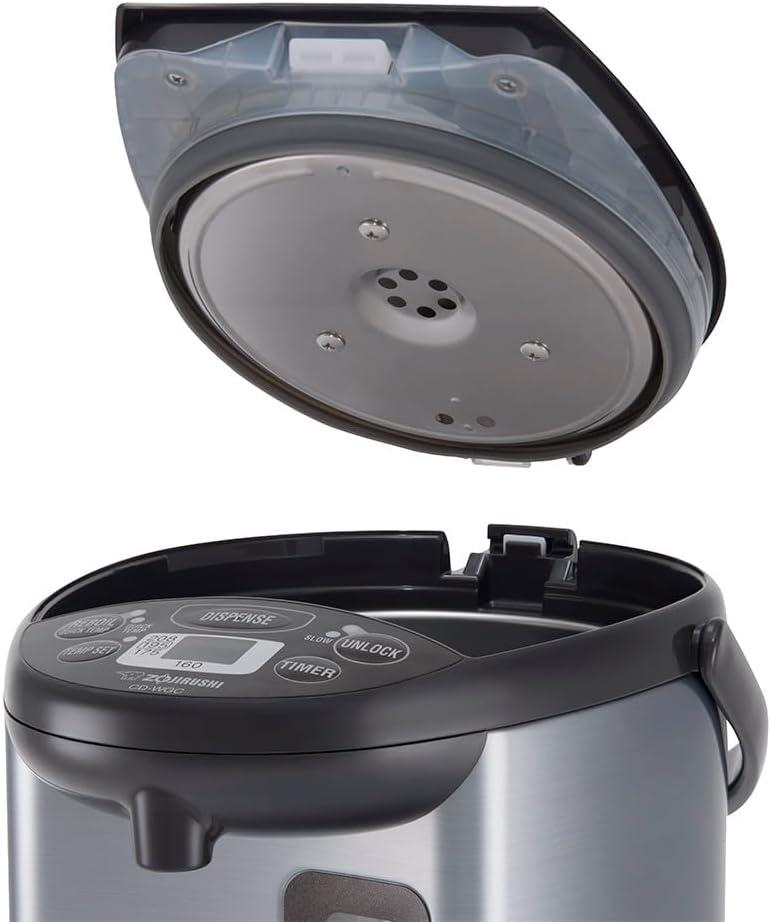 Zojirushi's Micom Water Boiler & Warmer, availalbe in 3.0 and 4.0 liter capacity, boils and keeps water hot at a set temperature for as long as it's plugged in. Select from one of 4 keep warm temperature settings (160 DegreeF, 175 DegreeF, 195 DegreeF, 208 DegreeF) which are the optimal temperatures for brewing different varieties of tea. The Optional Quick Temp mode reaches 160 DegreeF, 175 DegreeF, or 195 DegreeF keep warm directly without reaching a boil. Includes energy-saving timer function (6-10 hours), Cafe drip dispensing mode for slower dispensing, and Swivel base for serving convenience. Interior is made of rust-resistant stainless steel. Zojirushi's Commitment to Safe Design: Automatic shut-off prevents boil dry; automatic dispense-lock prevents accidental dispensing; in-spout and in-lid protection prevents leakage when tilted or tipped over, or dripping after dispensing.